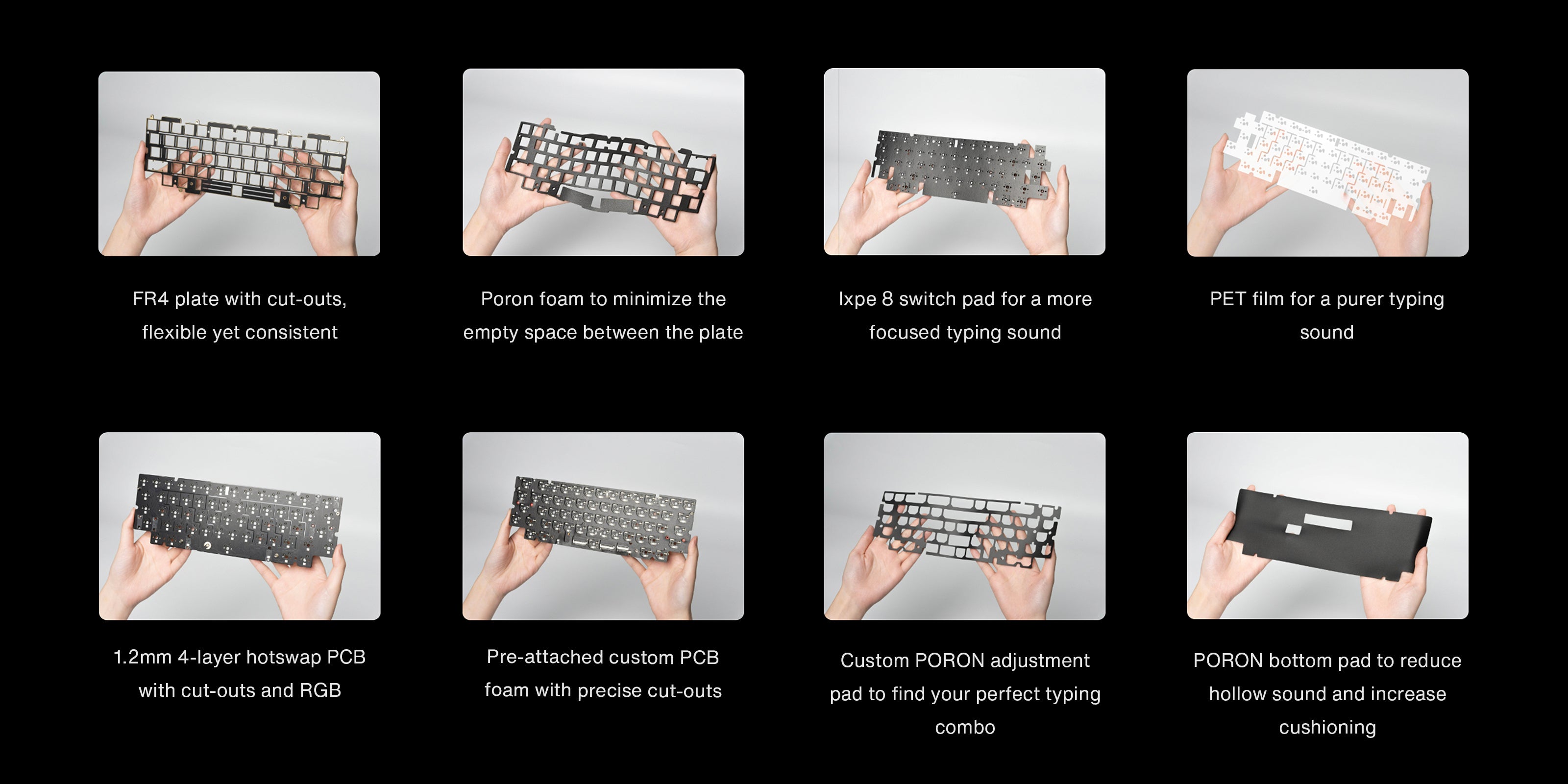 1.2mm thickness, 4 layers with cut-outs, supports in-switch LEDs and hotswap; USB Type-C port (supports C to C); Bluetooth 5.1; supports DIY keymapping and lighting effects