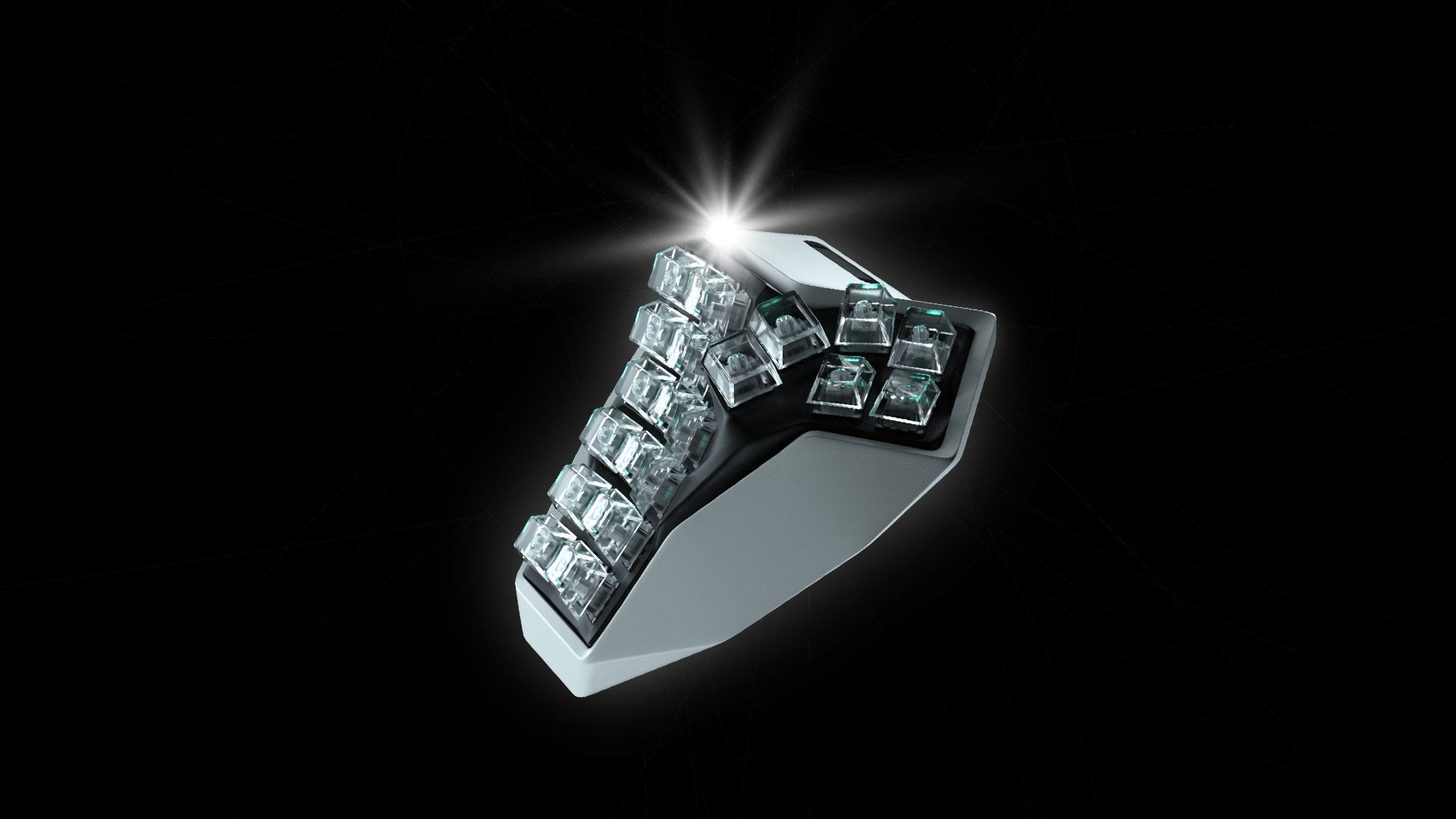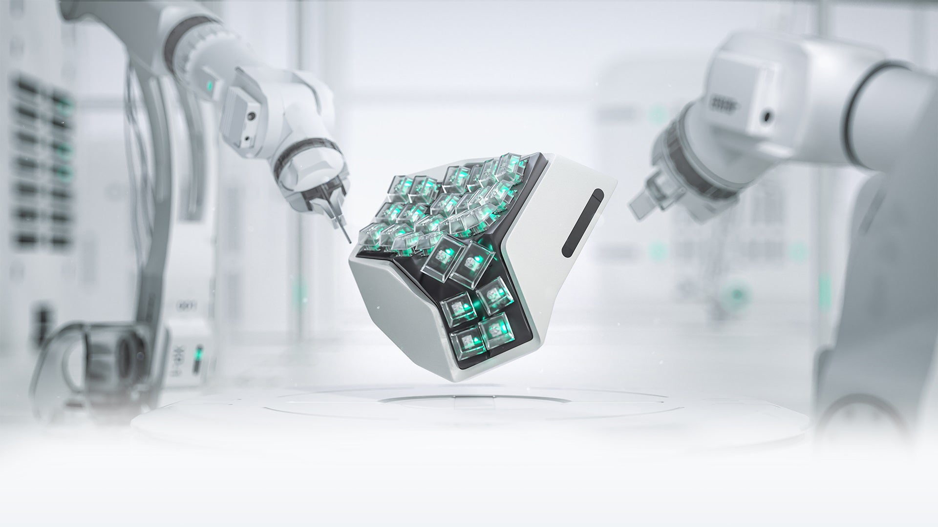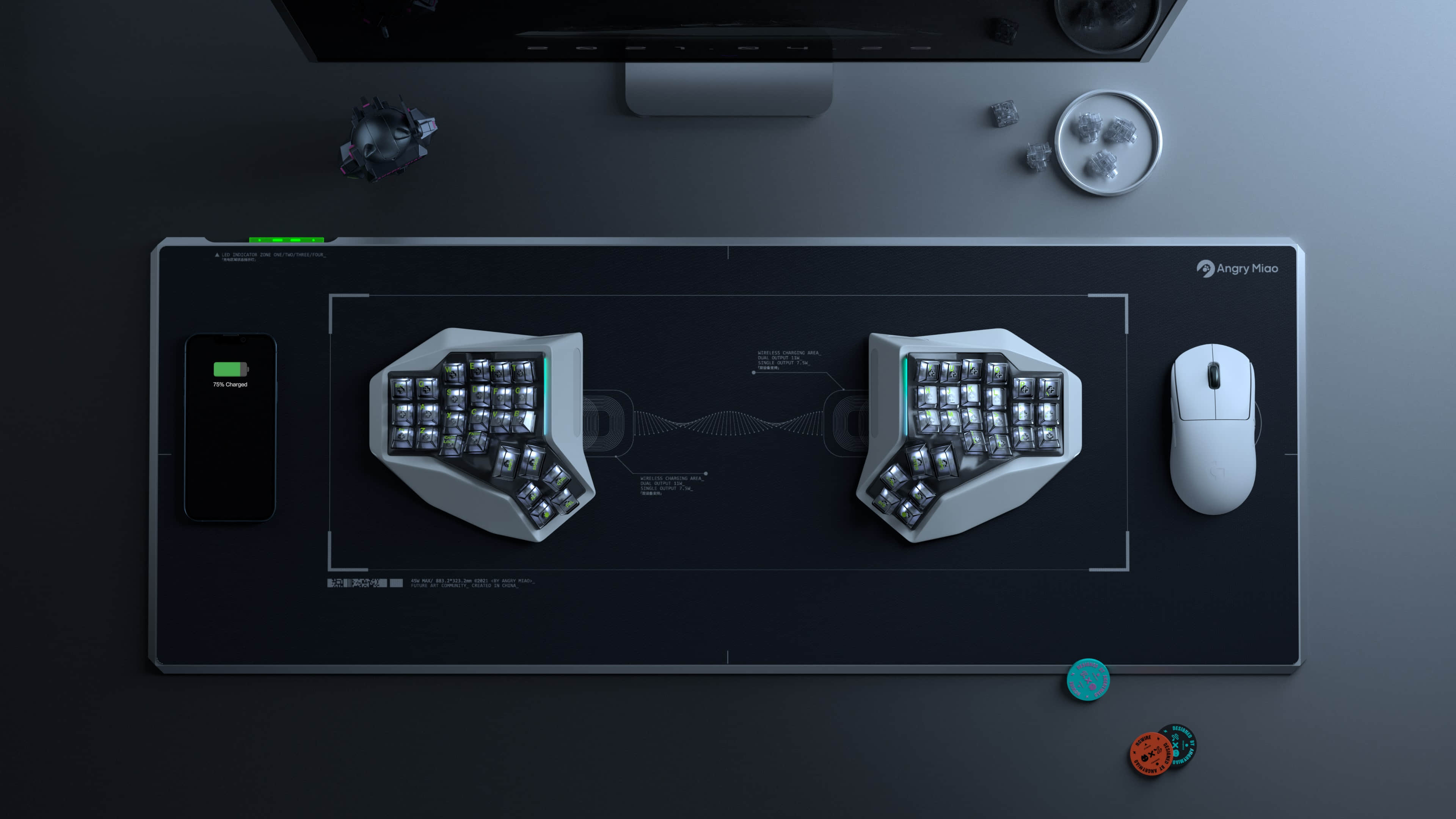 Although the left and right parts of the keyboard are separated, we developed an innovative new way to connect 3 devices (2 keyboards and input device) simultaneously over two wireless communication protocols.