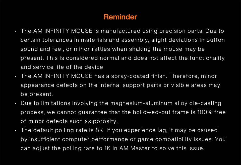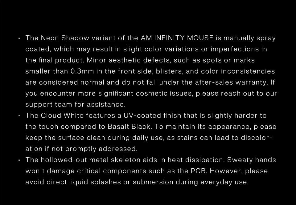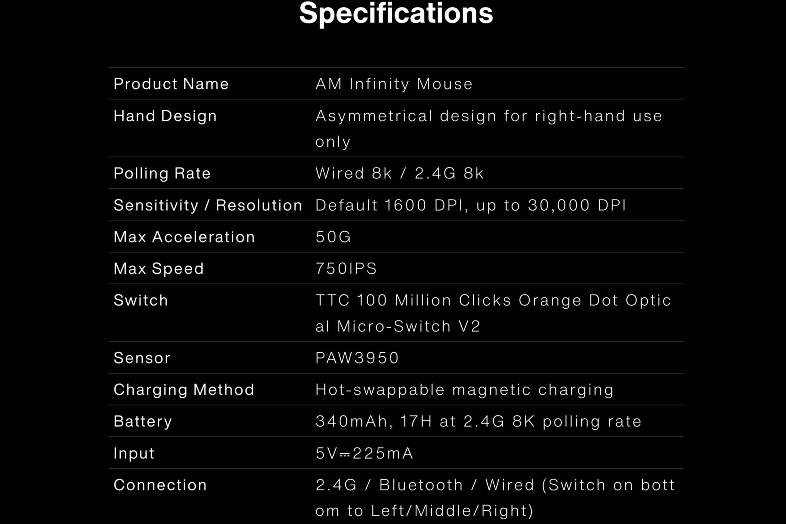 The AM INFINITY MOUSE is equipped with the flagship PAW3950 sensor, delivering unprecedented hardware performance.