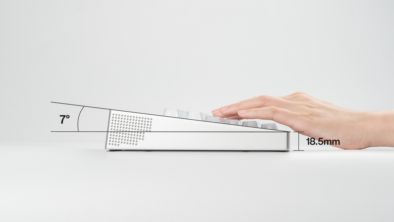 By removing the batteries and wireless charging module, we were able to achieve a 18.5mm front height with a 7-degree typing angle, providing a more comfortable and ergonomic experience for both daily use and gaming.