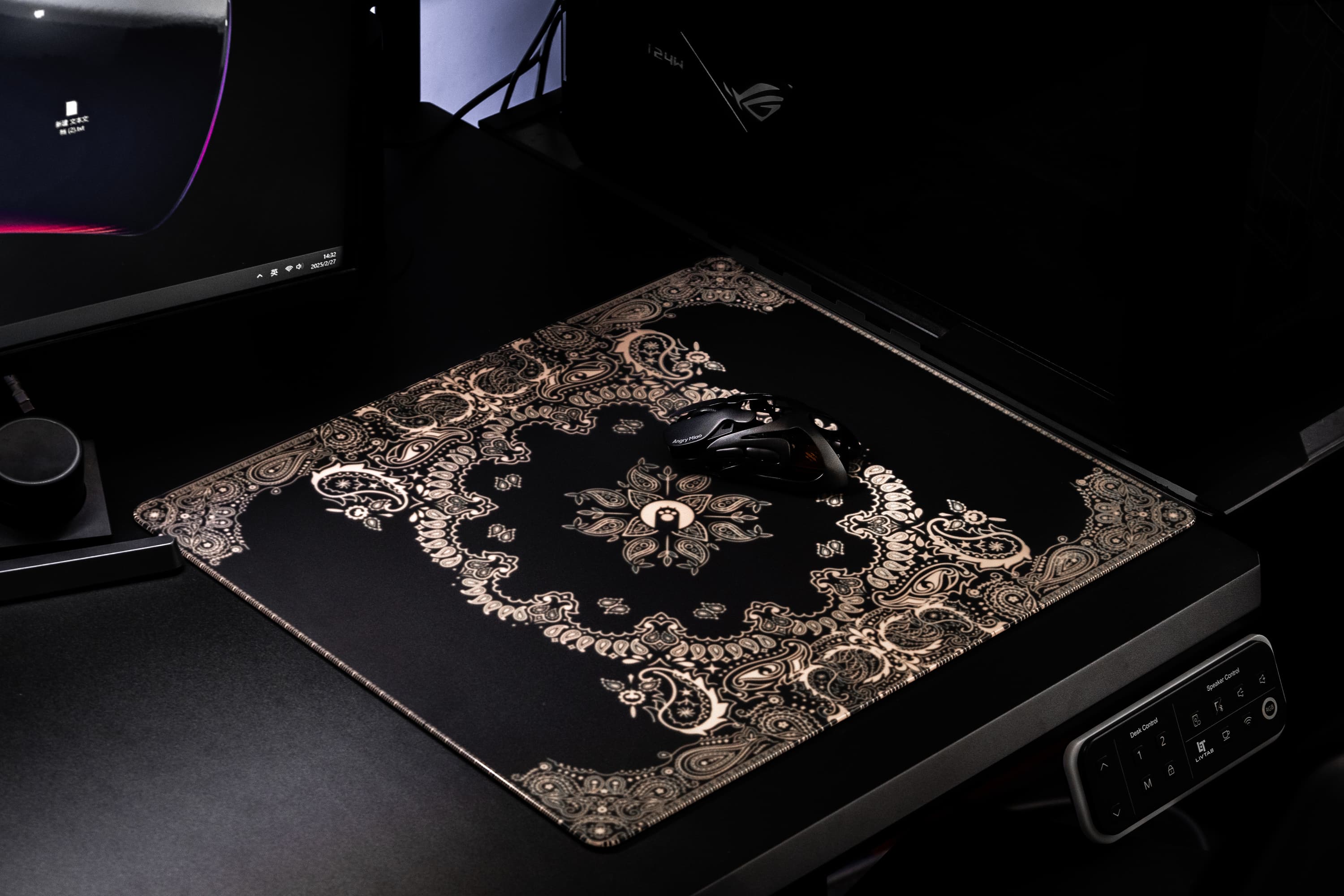 This glass mouse pad features a black and gold paisley pattern with an ultra-fine 2μm etched texture.