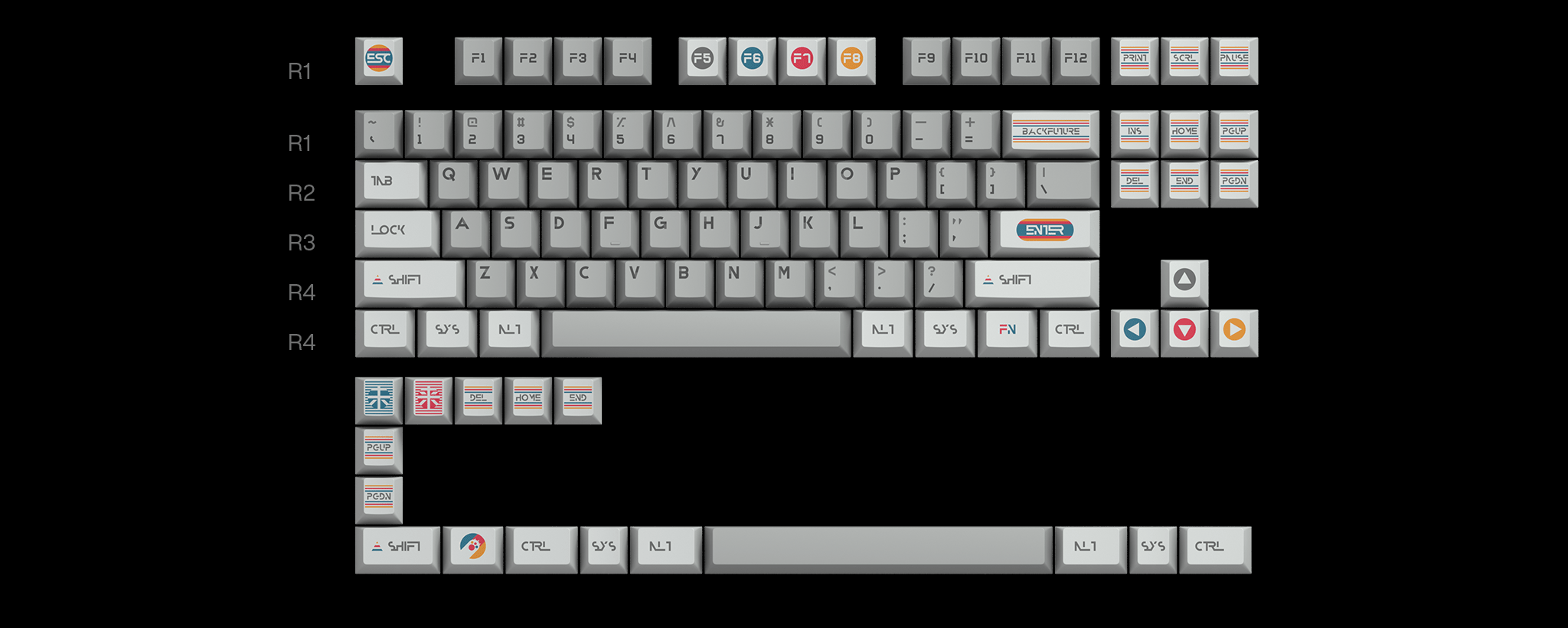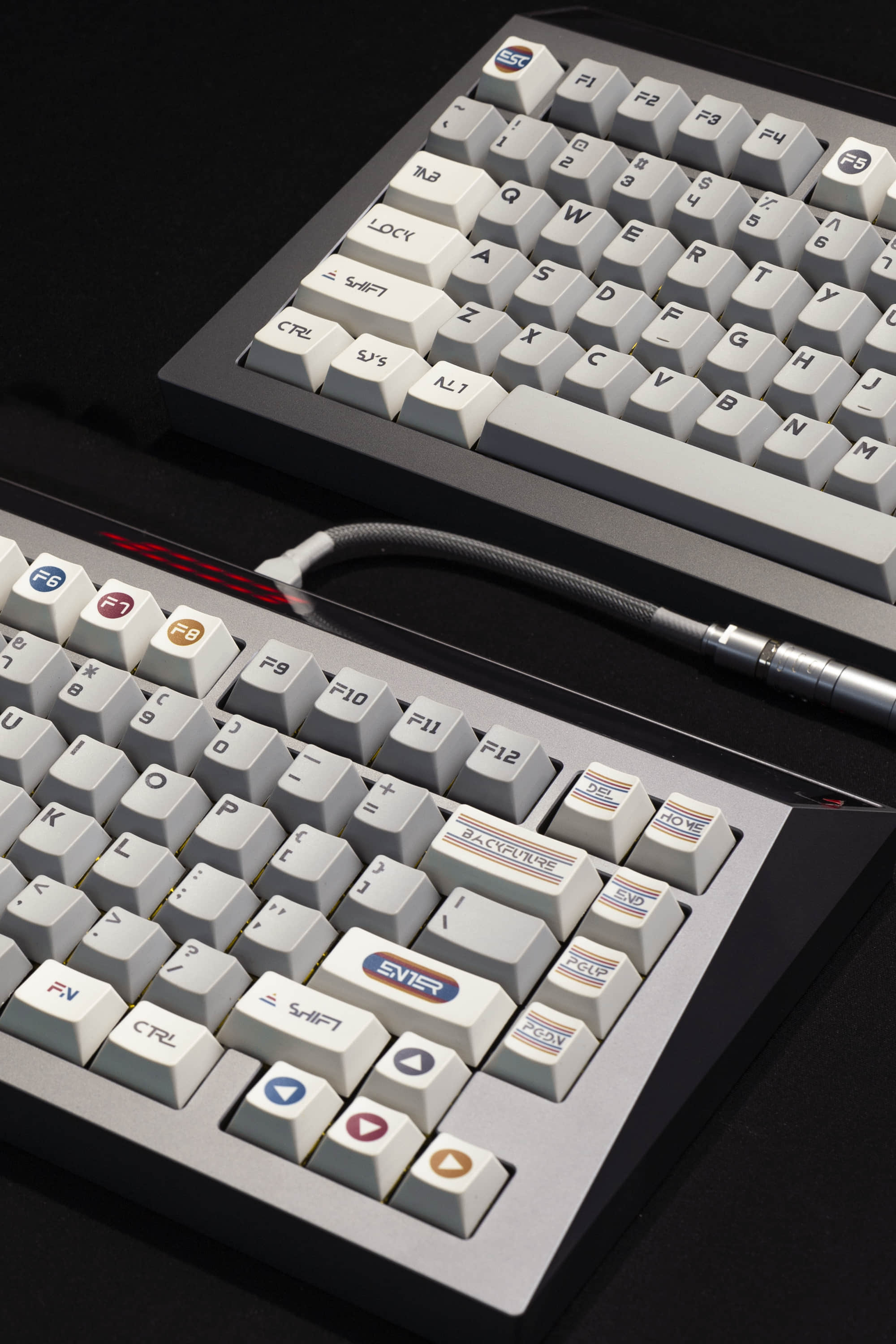 Both look and feel have been taken into consideration with these keycaps. Its OEM profile perfectly matches CYBERBOARD. Fonts and colors are borrowed from 1980s "high-tech", while its packaging takes inspiration from cassettes and videotapes. And with today's dye-sublimation technology, the keycaps are finished in "period correct" gray for that true retro-futuristic feel.
