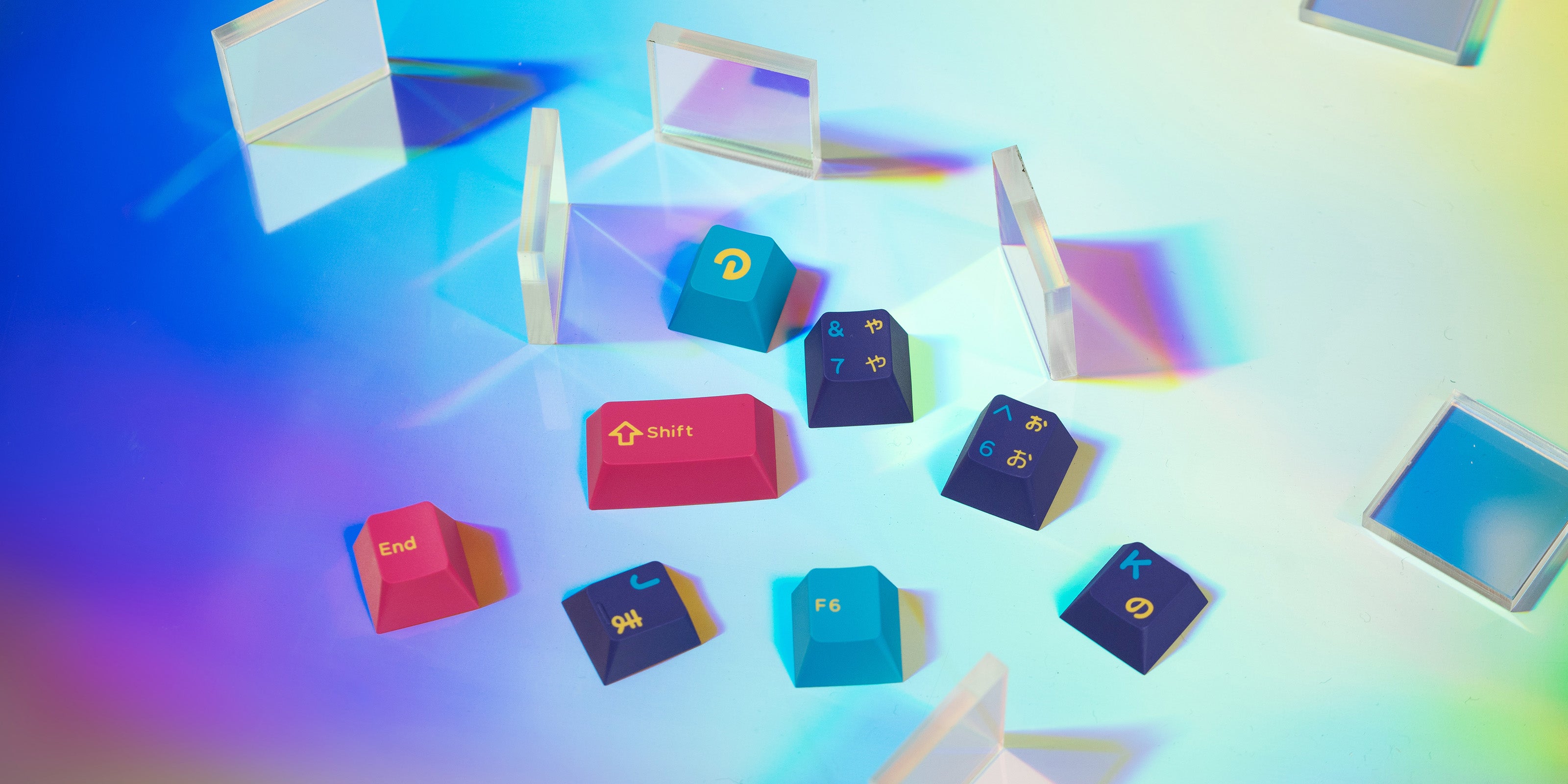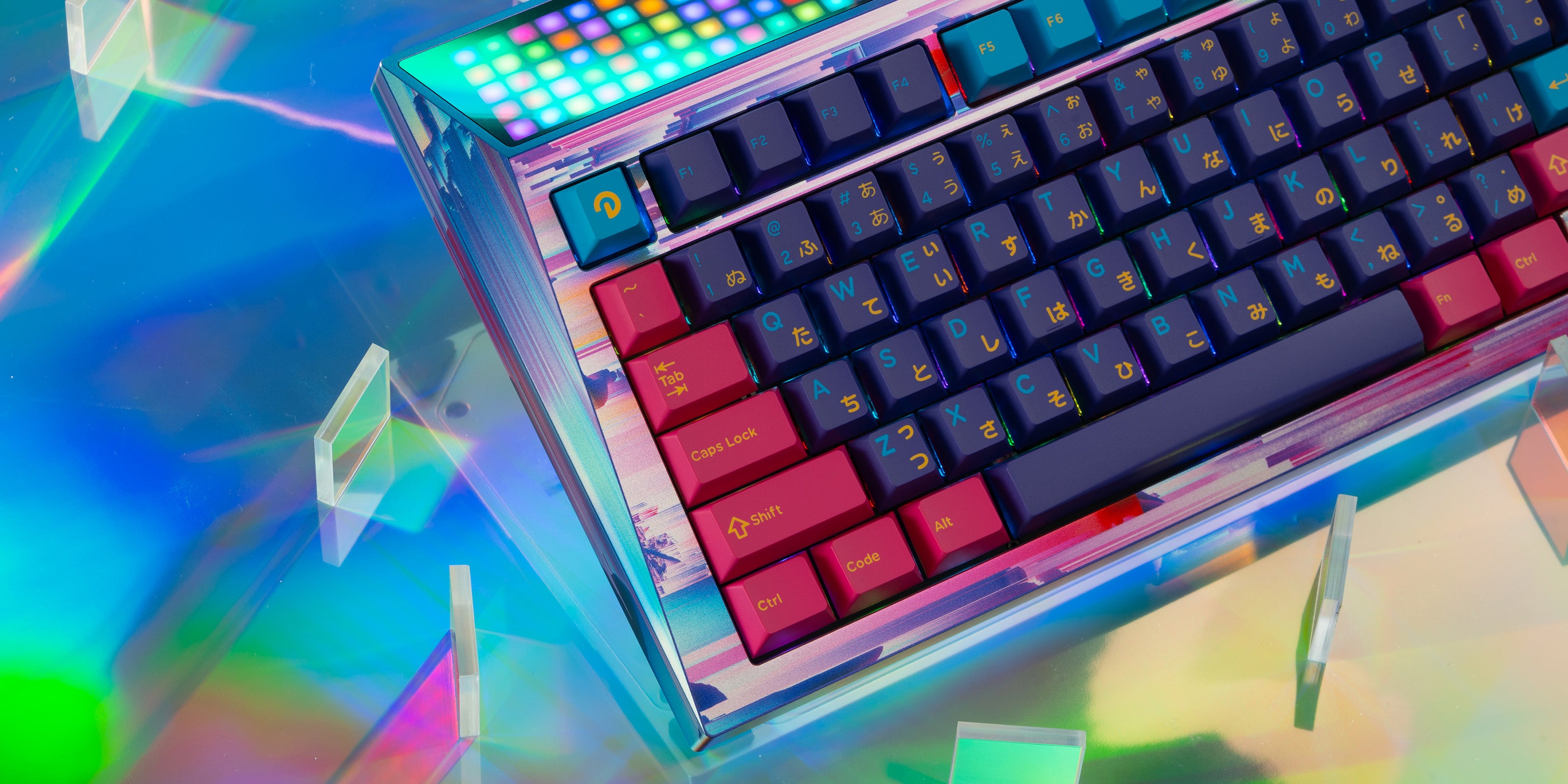 The Domikey Pumper triple shot ABS keycaps light up CYBERBOARD Novel 3 Euphoria with a radiant, Cyberpunk-leaning color scheme. Featuring bold purples, bright neon pinks, eye-catching blues, and accented with complementary legends, this set is anything but subtle.