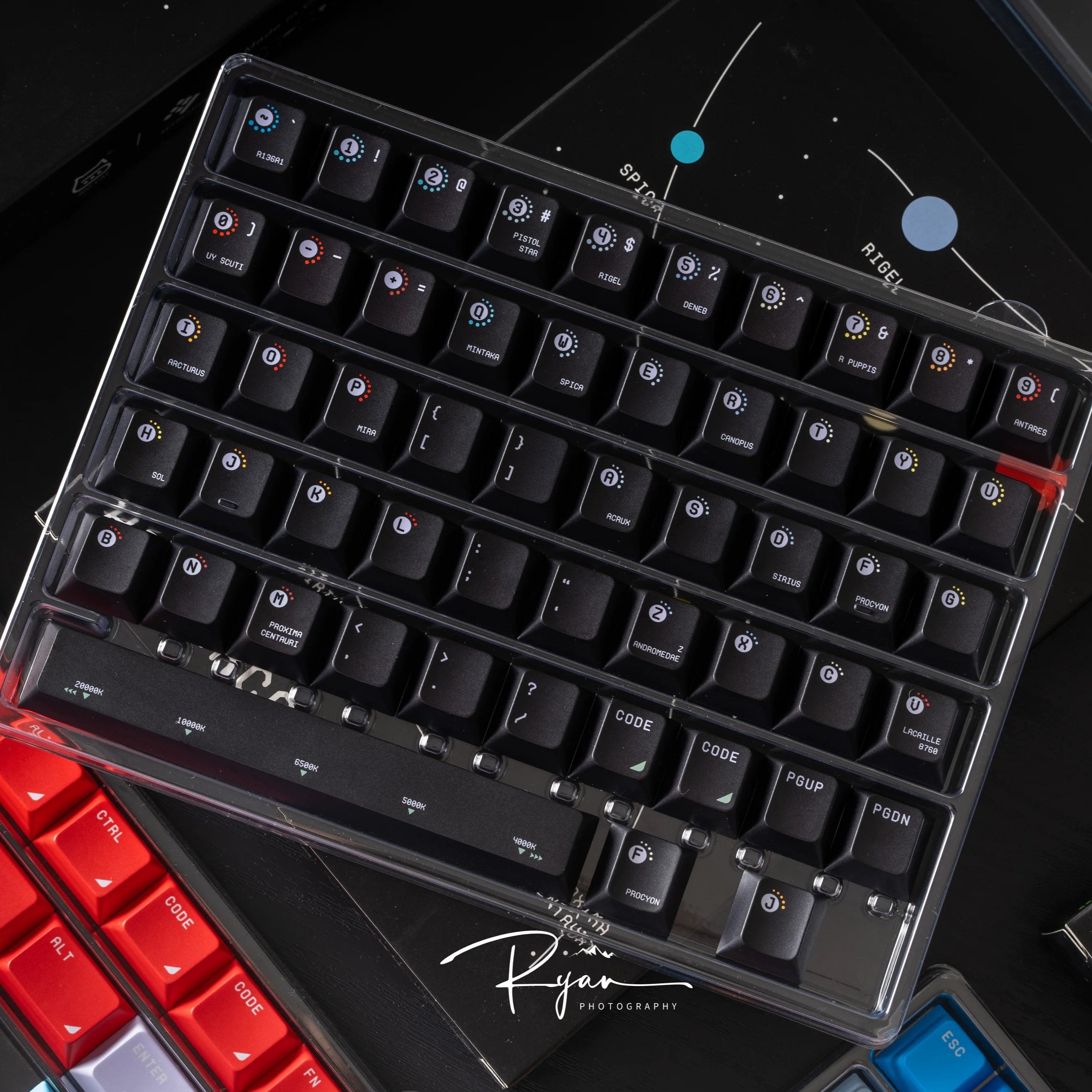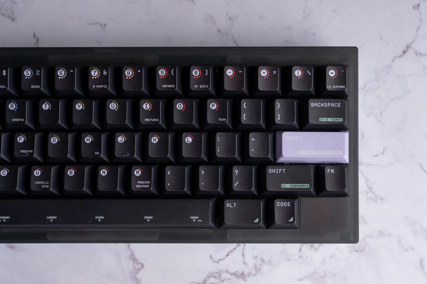 Inspired by the Hertzsprung-Russell diagram and stellar spectra, the Hipparcos Cherry Profile PBT Keycaps bring the vibrant and colorful essence of the night sky to life. This set aims to capture the wonder of the cosmos, offering a dynamic and colorful design.