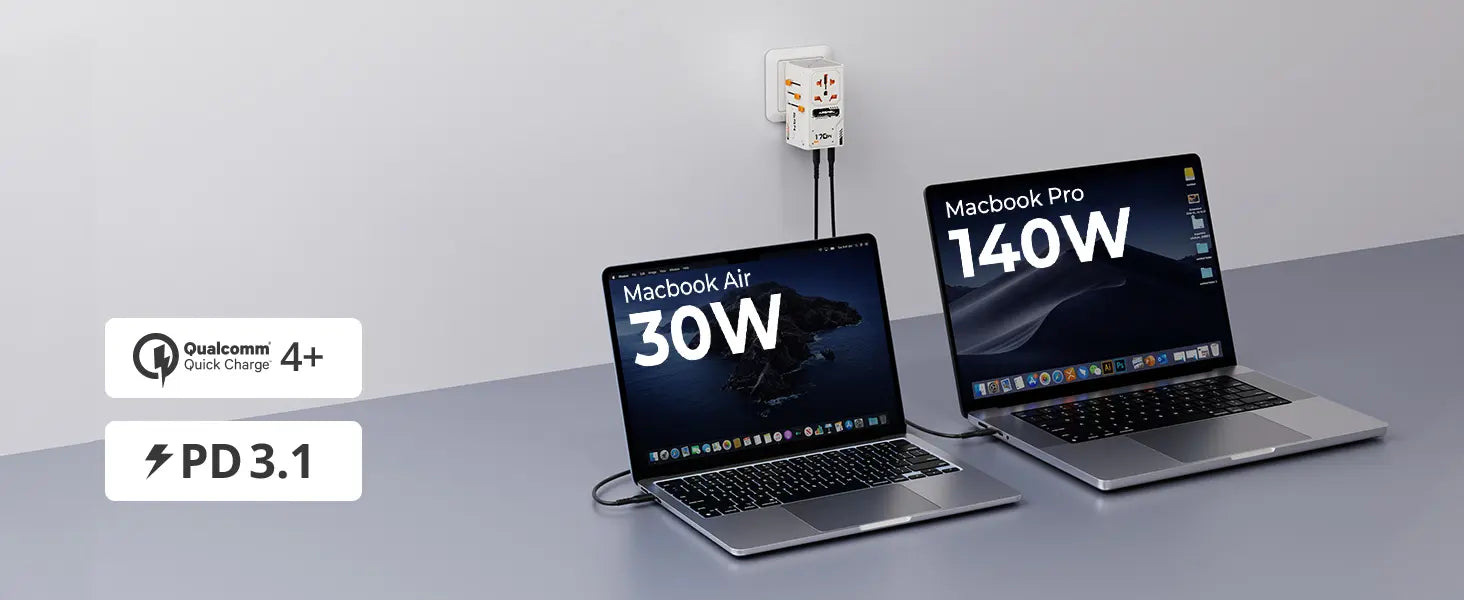 Experience the convenience of 170W PD fast charging. With a blazing-fast 140W single port output, it's perfect to quickly charge your MacBook Pro 16" while minimizing cable clutter. This makes it the perfect solution for travel enthusiasts who need efficiency and portability in their tech. Say goodbye to tangled cords and hello to streamlined charging on the go!